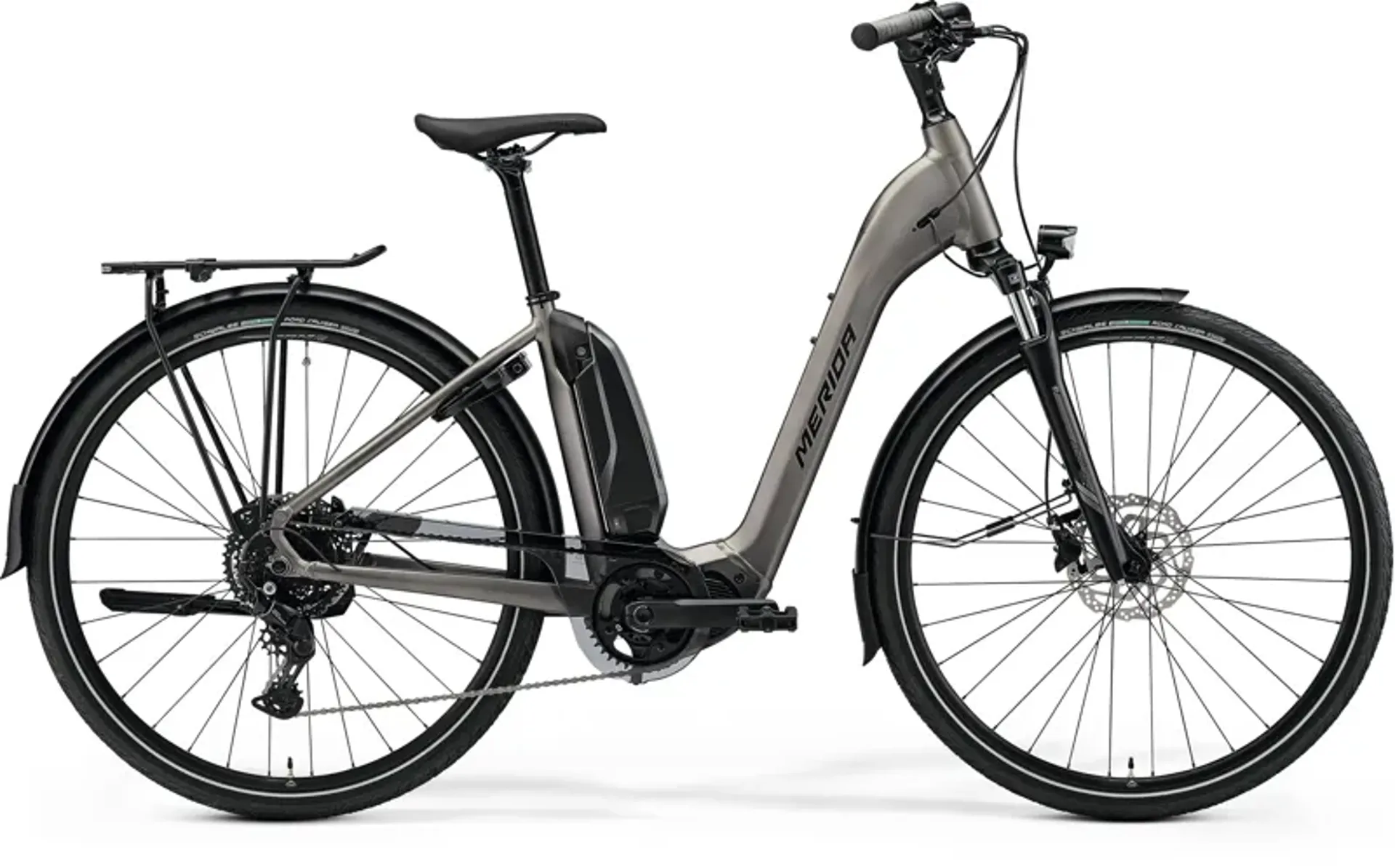By using a low-step-through frame with an easy-to-remove external battery, Merida can deliver a quality e-bike at a price that's hard to argue. The eSPRESSO CITY 300 EQ delivers all the convenience of a city e-bike with added off-road ability. That's because the low step-through frame has an easy-to-access 418 Wh battery and a reliable Shimano EP5 drive unit. While the suspension fork and seat post help keep you comfortable when it gets bumpy, they've fitted it with a host of kit to make city life easier and safer, with mudguards, rack, lights, lock and a kickstand as standard. A smooth-shifting Shimano 9-speed drivetrain and strong, low-maintenance hydraulic disc brakes add fuss-free control.